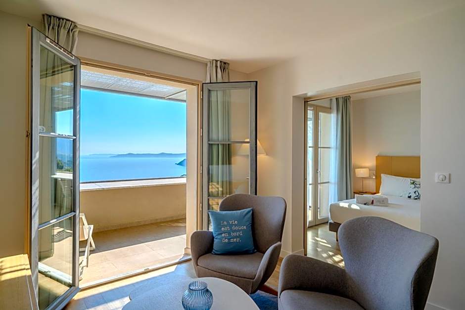 This sea view suite is composed of 2 separated rooms : one room with a king size double bed (180x200) and a second independant bedroom with 2 bunk beds (90x190). A living room, fitted-out private terrace with a panoramic view. The bathroom with an Italian-style shower, Rituals beauty products, bathrobe, slippers & Hair-dryer. Please note this room can accommodate an extra bed (80x190) for a fifth person (child until 12 y.o) with an extra cost of 30 € per night.