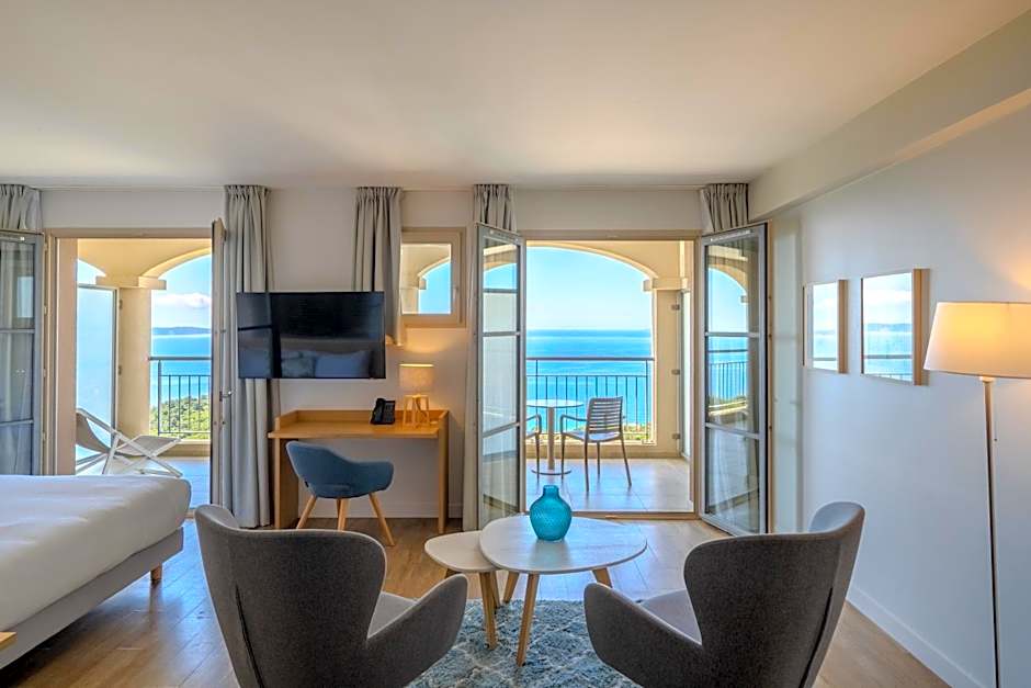 Junior Suite with Sea View is 441 square feet and includes a king-size bed 150-183 width plus living room, terrace, extra beds on demand, desk, satellite tv , hairdryer, bathrobes, and slippers.