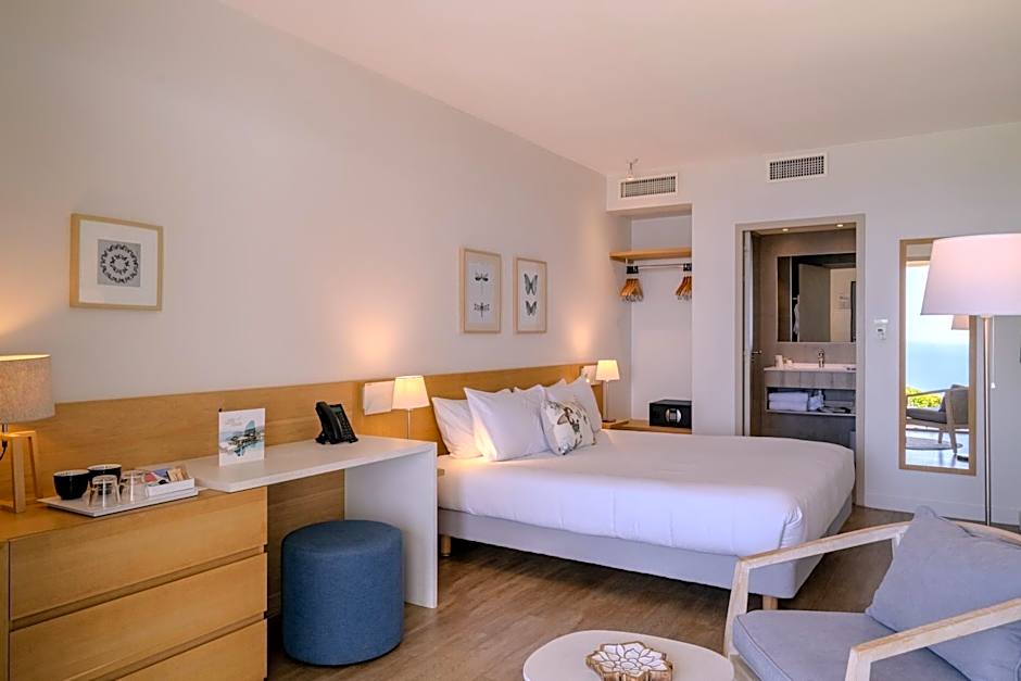Superior Room with Sea View is 269 square feet and includes a king-size bed 150-183 width plus terrace, desk, satellite tv , hairdryer, bathrobes, and slippers and is Wheelchair-accessible with a Disability-friendly bathroom.