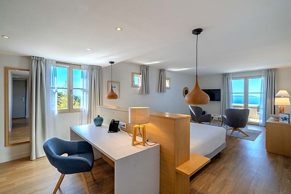 This sea view suite is composed of 2 separated rooms : one room with a king size double bed (180x200) and a second independant bedroom with 2 bunk beds (90x190). A living room, fitted-out private terrace with a panoramic view. The bathroom with an Italian-style shower, Rituals beauty products, bathrobe, slippers & Hair-dryer. Please note this room can accommodate an extra bed (80x190) for a fifth person (child until 12 y.o) with an extra cost of 30 € per night.